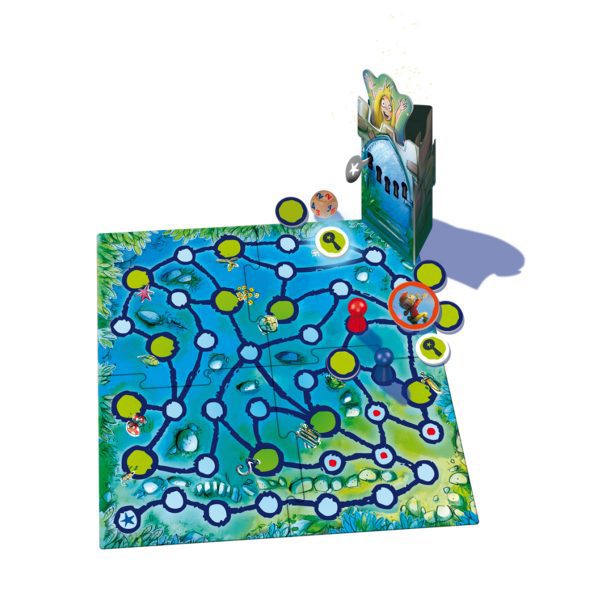 Tu misión es encontrar la única llave magnética escondida bajo una de las 16 baldosas del bosque para luego ir a la torre y probar suerte en la cerradura correcta. ¡Pero cuidado! El malvado Cuervo Negro también está en el tablero, y si tu rival lo mueve con éxito, podría bloquear tu camino o llegar antes.
